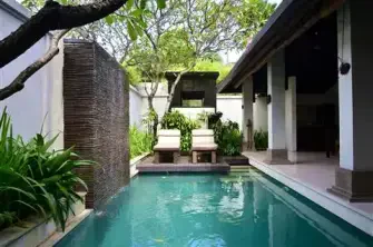 A variety of rooms and villas are available, with features like private pool, outdoor shower, modern kitchen, flat screen TV with DVD player, free WiFi, air conditioning and dining area.